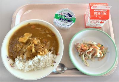 ポークカレー、大根サラダ、ヨーグルト、牛乳