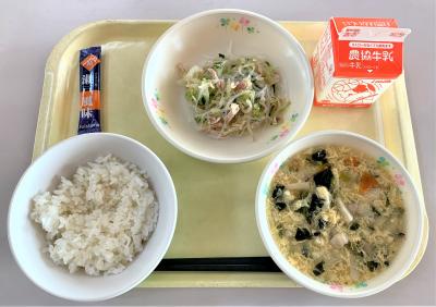 ごはん、卵とじ煮、春雨サラダ、ふりかけ、牛乳