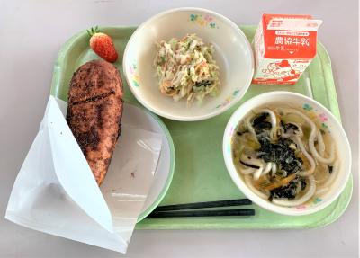ココア揚げパン、五目うどん、かみかみサラダ、いちご、牛乳