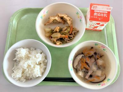 ごはん、揚げギョウザ、ホイコウロウ、中華スープ、牛乳