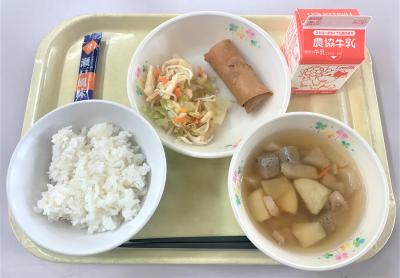 ごはん、揚げ春巻き、ごま酢和え、鶏と大根のさっぱり煮、ふりかけ、牛乳