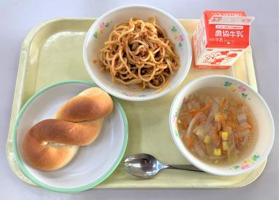 米粉パン、ミートソーススパゲティ、コンソメスープ、牛乳