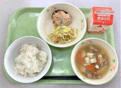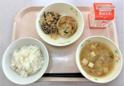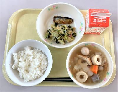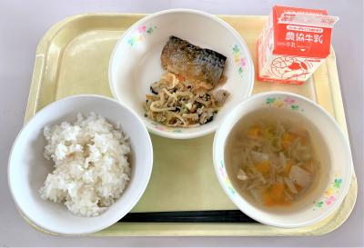 ごはん、サバのみぞれ煮、切干大根のピリ辛炒め、鶏とごぼうのすまし汁、牛乳