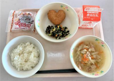 ごはん、ハートのコロッケ、磯辺和え、せん切りスープ、お米のガトーショコラ、牛乳