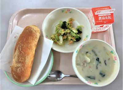 きなこパン、白菜と“のと115”の米粉シチュー(穴水産のと115使用)、ツナサラダ、牛乳