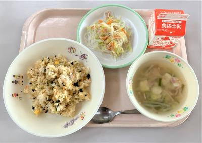 ひき肉キムチチャーハン、豆腐スープ、中華和え、牛乳