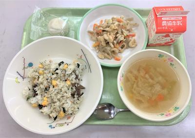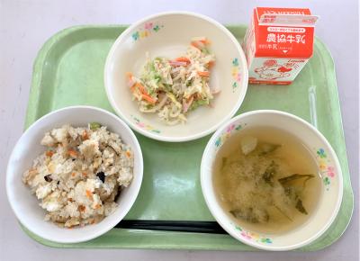 五目ごはん、みそ汁、切干大根サラダ、牛乳