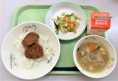 ごはん、ちくわのごま揚げ、ひじきの炒め煮、みそ汁、牛乳