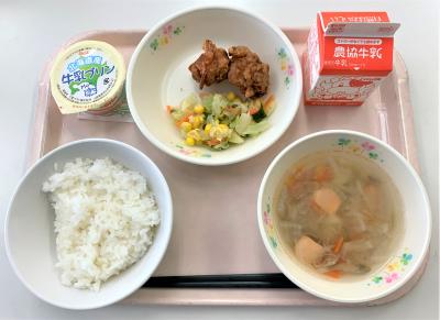 ごはん、鶏ザンギ、コーンサラダ、三平汁、牛乳プリン、牛乳