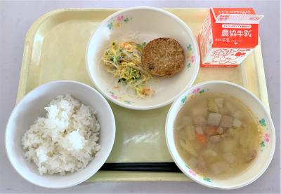 ごはん、かぼちゃのコロッケ、バンサンスー、麹のポトフ、牛乳