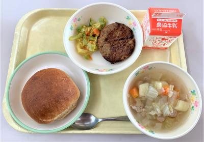 セルフハンバーガー(ハンバーグ、カレーソテー)、冬野菜のポトフ、牛乳