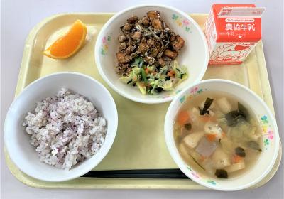ゆかりごはん、大豆と小魚の揚げ煮、お浸し、みそけんちん汁、デコポン、牛乳