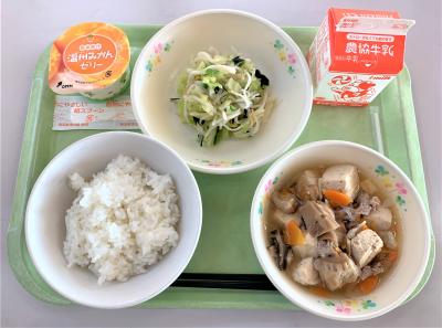 ごはん、肉豆腐、辛み和え、みかんゼリー、牛乳
