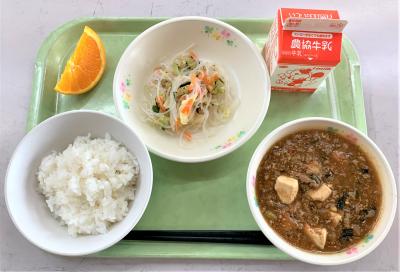 ごはん、マーボー豆腐、春雨サラダ、オレンジ、牛乳