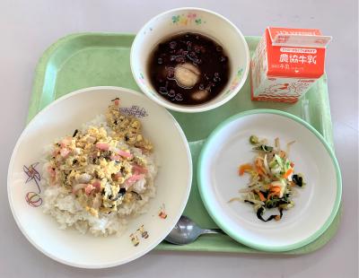 親子丼、お浸し、白玉ぜんざい、牛乳