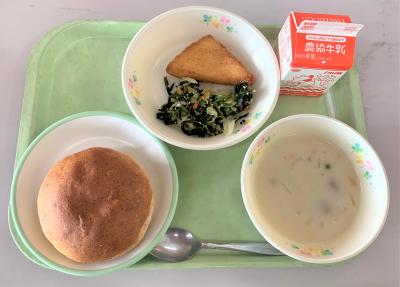 胚芽バンズ、チーズはんぺんフライ、ごま和え、ミートボールのクリーム煮、牛乳