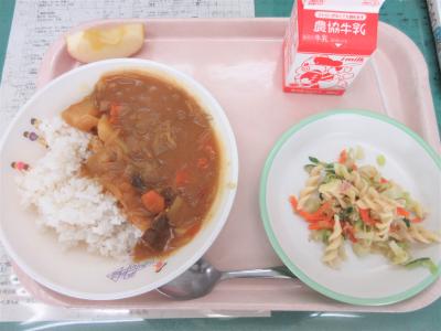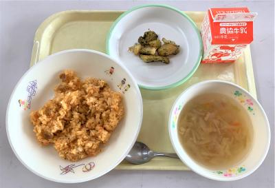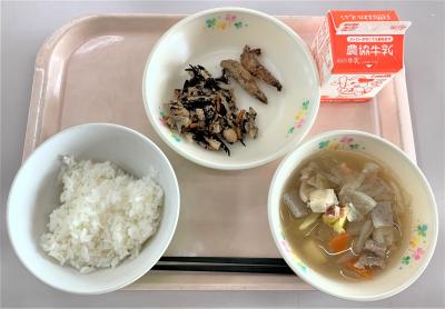 ごはん、いわしの唐揚げ、ひじきの炒り煮、めった汁、牛乳