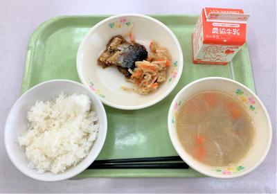 ごはん、サバの生姜煮、切干大根のはりはり漬け、みそけんちん汁、牛乳