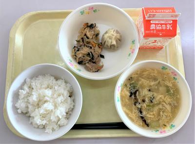 ごはん、ショウロンポウ、しらたきのチャプチェ、中華風コーンスープ、牛乳