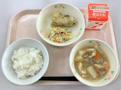 ごはん(ひゃくまん穀)、ちくわの磯辺揚げ、かみかみサラダ、豚汁、牛乳