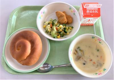 ミルクロール、チキンナゲット、コーンサラダ、かぼちゃシチュー、牛乳