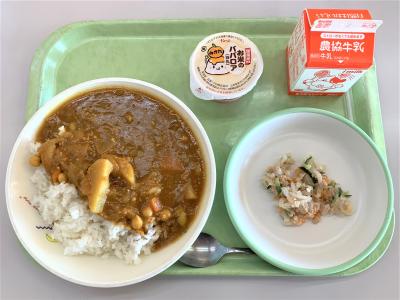 ビーンズカレー、大根サラダ、お米のババロア、牛乳