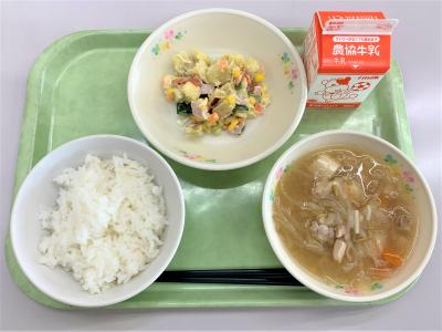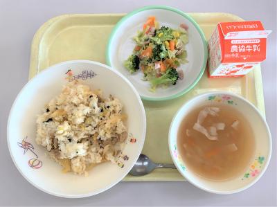 キムタクごはん、せん切りスープ、ブロッコリーサラダ、牛乳