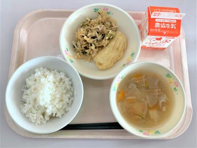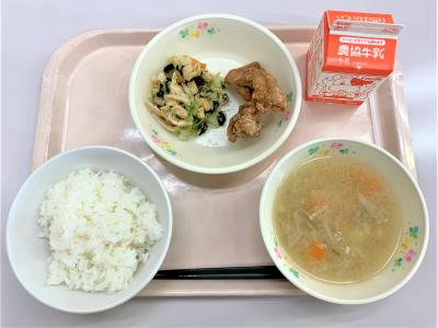 ごはん、鶏の竜田揚げ、ごま和え、けんちん汁、牛乳