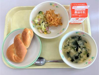 2022年12月8日 15時15分米粉パン、クリスピーチキン、コーンサラダ、卵スープ、牛乳