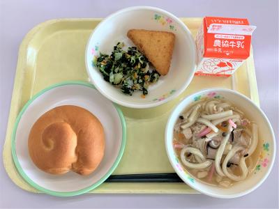ミルクロール、チーズはんぺんフライ、ごま和え、きのこあんかけうどん、牛乳