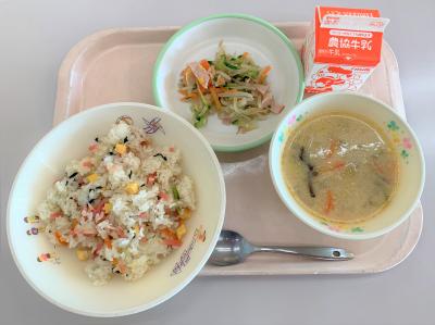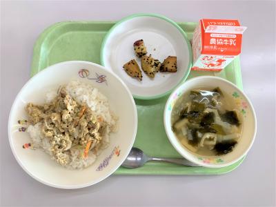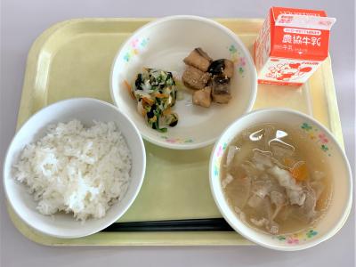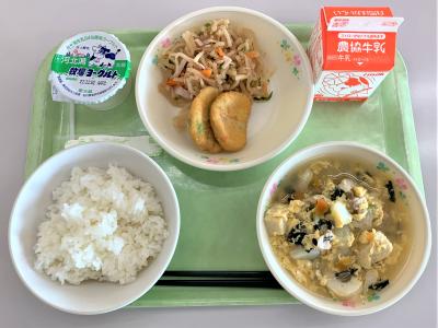 ごはん、豆腐ナゲット、切干大根の酢の物、卵とじ、ヨーグルト、牛乳