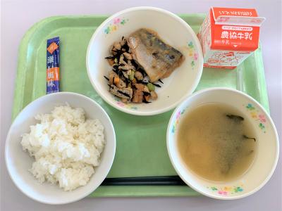 ごはん、サバのみそ煮、大豆の磯煮、なめこ汁、ふりかけ、牛乳
