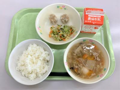 ごはん、シューマイ、ごま酢和え、八宝菜、牛乳