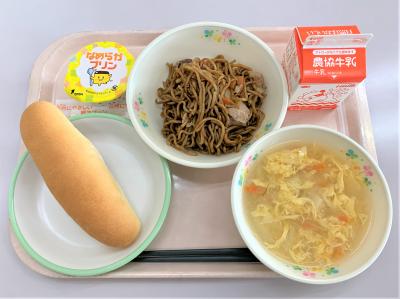 コッペパン、焼きそば、卵スープ、プリン、牛乳
