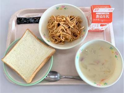 食パン、ミートソーススパゲティ、コーンスープ、黒ごまクリーム、牛乳