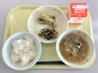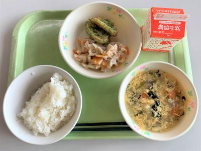 ごはん、卵とじ、笹かまの磯辺揚げ、れんこんのきんぴら、牛乳