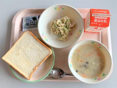 食パン、さつまいもシチュー、切干大根のサラダ、ブルーベリージャム、牛乳