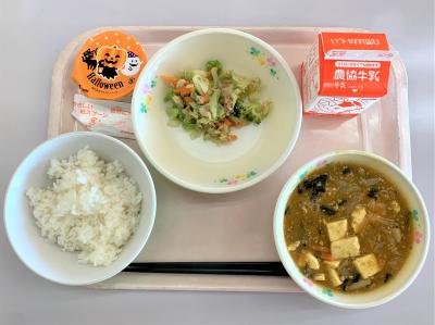 ごはん、豆腐のカレー煮、ツナサラダ、ハロウィンデザート、牛乳
