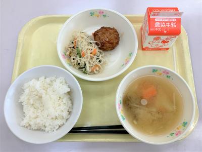 ごはん、鶏と野菜の焼きつくね、五目ビーフン、芋のこ汁、牛乳