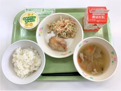 ごはん、鶏の照り焼き、かみかみサラダ、めった汁(穴水町産さつまいも使用)、加賀しずく入り梨ゼリー、牛乳