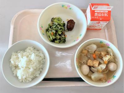 ごはん、おでん、肉団子の和風あんかけ、磯辺和え、牛乳