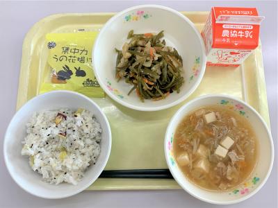 さつまいもごはん(穴水町産さつまいも使用)、豚キムチ鍋(穴水町産白菜使用)、茎ワカメのきんぴら、おからスナック、牛乳