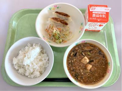 ごはん、焼きギョウザ、春雨サラダ、マーボー豆腐、牛乳