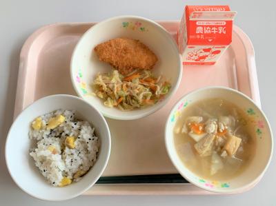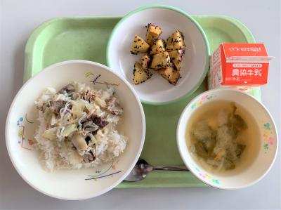 栗ごはん(穴水産栗使用)、鮭チーズフライ、お浸し、けんちん汁、牛乳