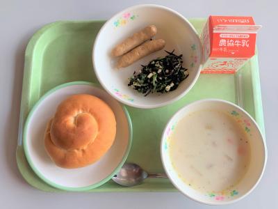 ミルクロール、クラムチャウダー、ボイルウインナー、ひじきサラダ、牛乳