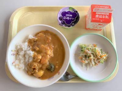 チキンカレー、もやしのナムル、巨峰ゼリー、牛乳