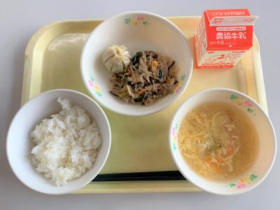 ごはん、ショウロンポウ、しらたきのチャプチェ、かきたま汁、牛乳