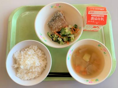 ごはん(ひゃくまん穀)、サバのカレー揚げ、塩こんぶ和え、さつま汁、牛乳