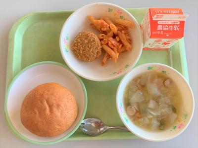 胚芽バンズ、メンチカツ、ペンネトマトソース、野菜スープ煮、牛乳