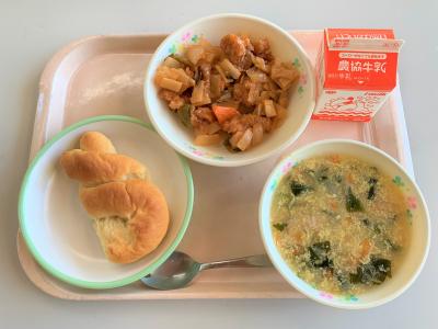 米粉パン、鶏と野菜のケチャップ炒め、華風コーンスープ、牛乳